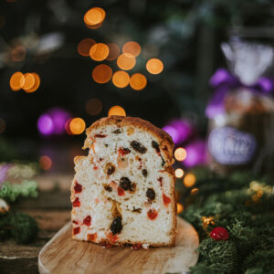 Agua, harina de arroz, almidón de yuca, azúcar, grasa vegetal, huevo, almidón de maíz, frutas confitadas de papaya (azúcar, papaya, colorantes rojo, azul, amarillo), pasas de uva, almidón modificado de maíz (como emulsificante), levadura, goma xantan (como espesante), ésteres de poliglicéridos de ácidos grasos y mono y diglicéridos de ácidos grasos (como emulsificante), sal, saborizante de vainilla, goma guar (como espesante), saborizante de naranja, propionato de calcio (0.1% como preservante).